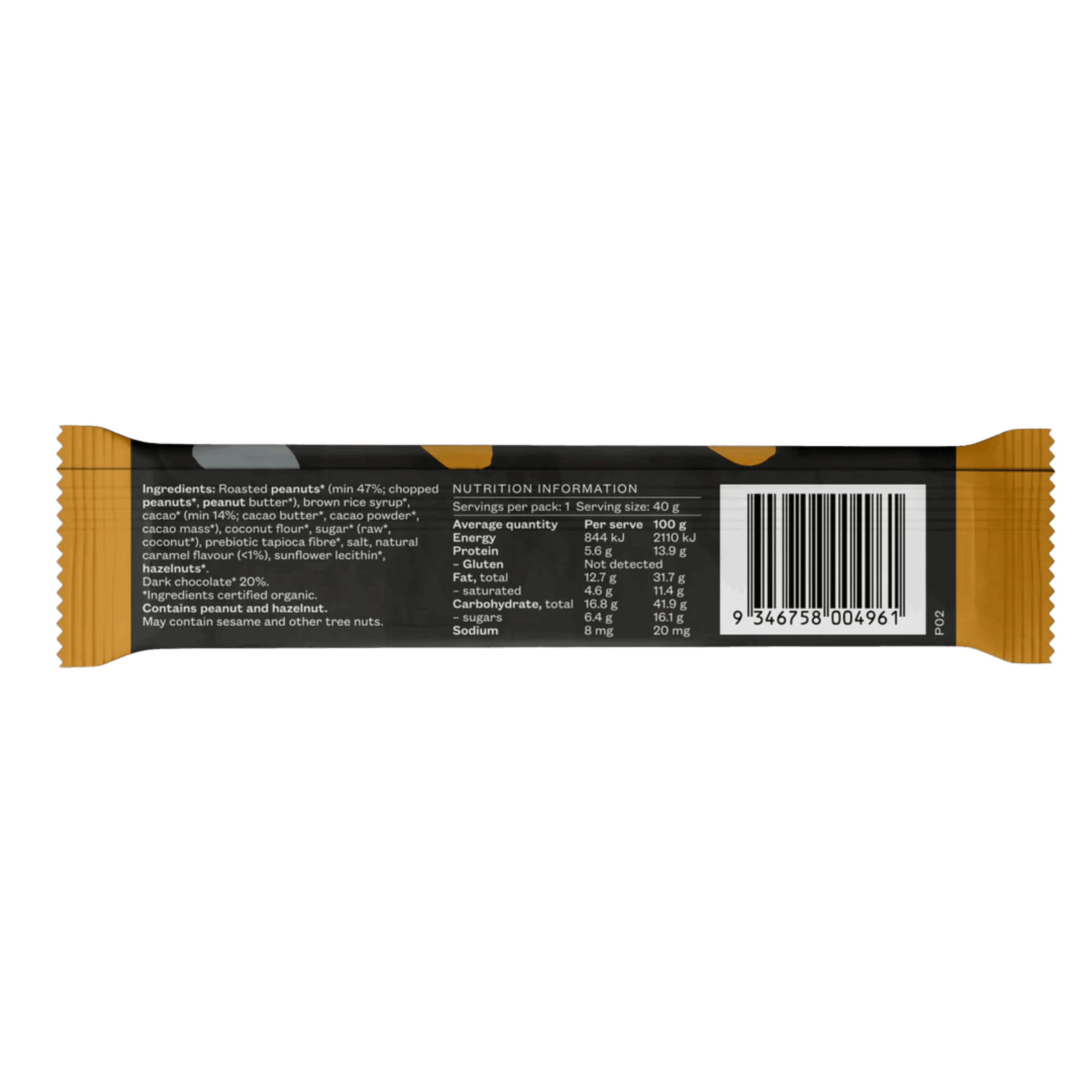 Organic ingredients include peanut (min 47%; peanut pieces, peanut butter), brown rice syrup, cacao (min 14%; cacao butter, cacao powder, cacao mass), coconut flour, raw sugar (coconut), prebiotic tapioca fibre, salt, natural caramel flavour (<1%), sunflower lecithin, and hazelnut pieces.