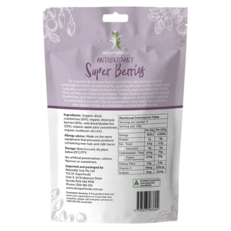 Packed with antioxidants, fibre, and vitamins, these berries help support overall health and wellness. They are a natural source of energy and aid digestion while promoting antioxidant protection against oxidative stress. Incorporating Organic Dried Super Berries into your diet can boost vitality and provide a nutrient-dense snack that complements any lifestyle. Additionally, they are vegan, gluten-free, and free from artificial additives.