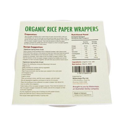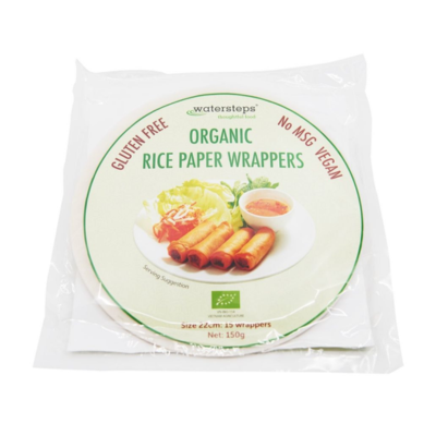 Watersteps Organic Rice Paper Wrappers are thin, gluten-free and vegan — made from organic rice and salt. Ideal for fresh spring rolls, summer rolls or light wraps.